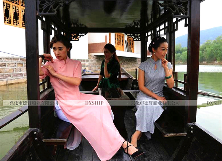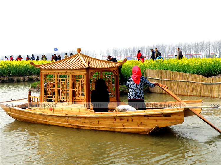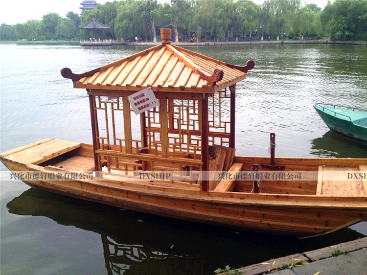 6.0米单亭船规格:6.0*1.9m核载:10人使用区域:B、C级航区(水库、人工湖、内河)材质:船体板材:2.5cm厚老龄杉木龙骨:非洲银口、冰糖果木动力配置:人工:手划桨航速:3~6Km/h电动:海伯推进器