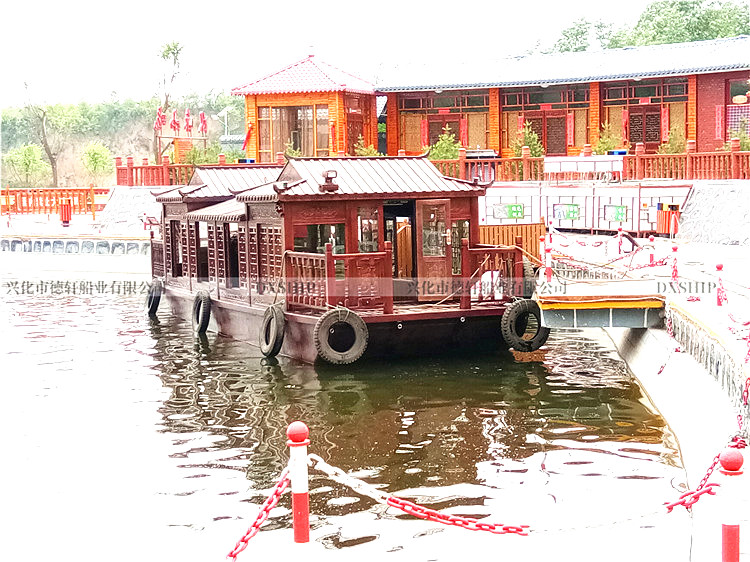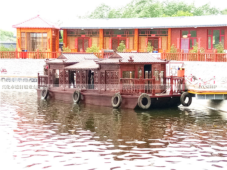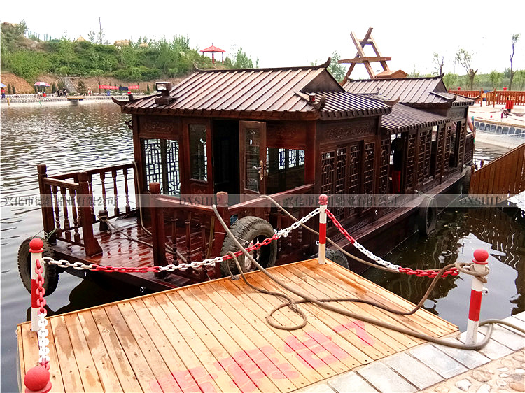 10.3米画舫船规格:10.3*3.2m核载:24人使用区域:B、C级航区(水库、人工湖、内河)材质:船体板材:4cm厚进口花旗松龙骨:印尼菠萝格、非洲银口、冰糖果木船体防护:10层高分子无碱玻璃纤维布(免维护)电动配置:电机:5.5KW*1台(永磁无刷)航速:8~12Km/h续航:根据要求搭配电池汽油配置:四冲程60匹(雅马哈后舷机)