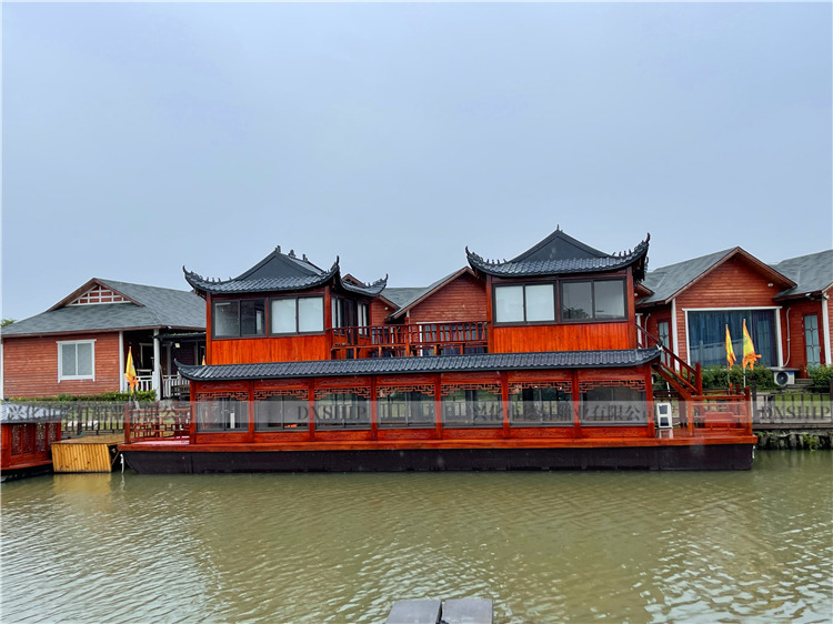16.0米画舫船规格:16.0*4.80m核载:80人使用区域:B、C级航区(水库、人工湖、内河)材质:船体板材:4cm厚进口花旗松龙骨:印尼菠萝格、非洲银口、冰糖果木船体防护:10层高分子无碱玻璃纤维布(免维护)电动配置:(选配)汽油配置:四冲程60匹(雅马哈后舷机)