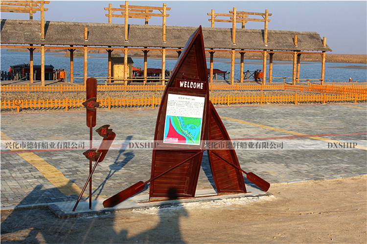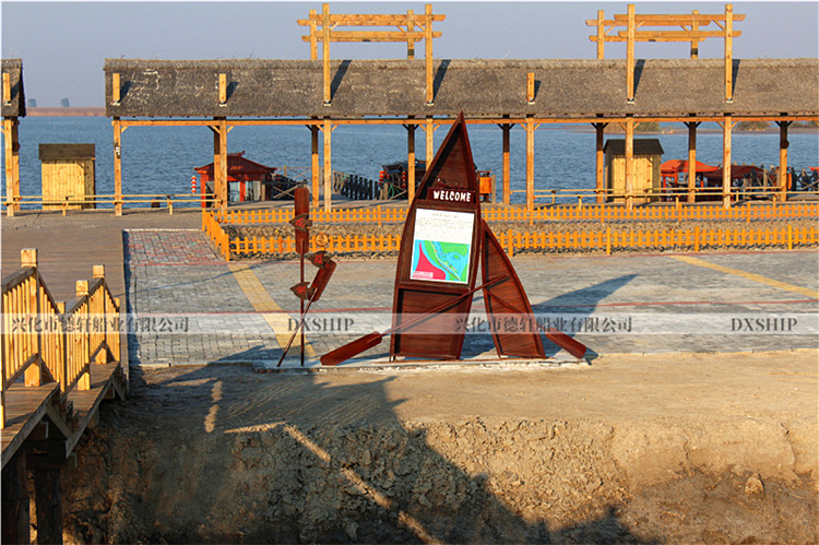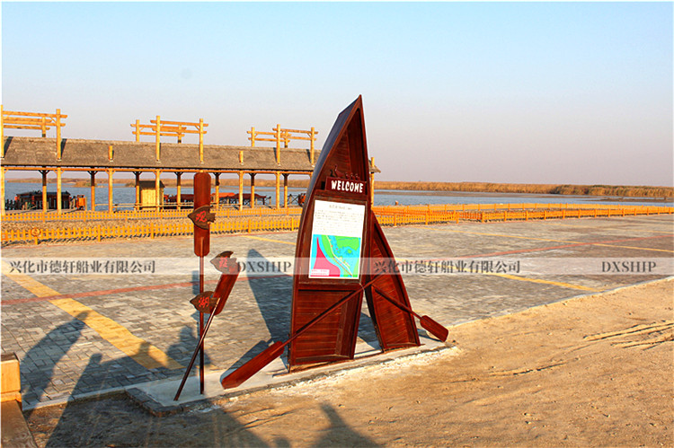 4.0米路标装饰船规格:订制产品(按客户要求)使用区域:室内、户外、下水都可以材质:船体板材:进口花旗松、老龄杉木龙骨:冰糖果木、非洲银口船体防护:船体整刷三遍桐油深度防腐处理备注:可按照客户提供图片或效果图款式制做