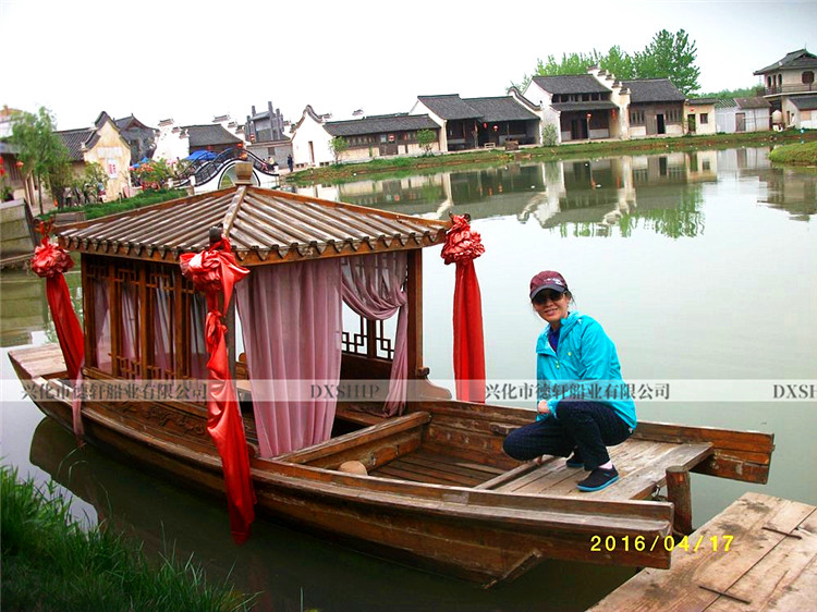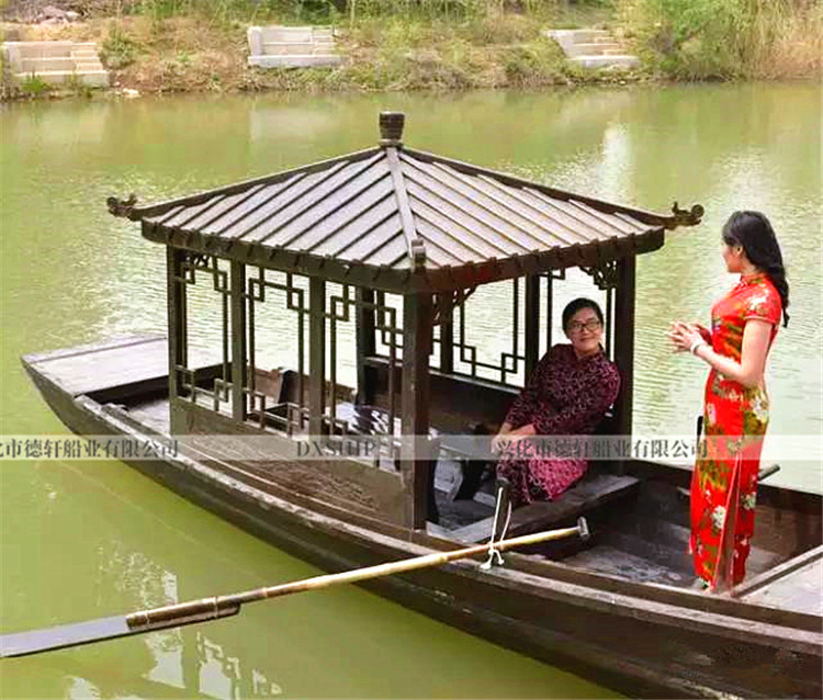 6.0米单亭船规格:6.0*1.9m核载:10人使用区域:B、C级航区(水库、人工湖、内河)材质:船体板材:2.5cm厚老龄杉木龙骨:非洲银口、冰糖果木动力配置:人工:手划桨航速:3~6Km/h电动:海伯推进器