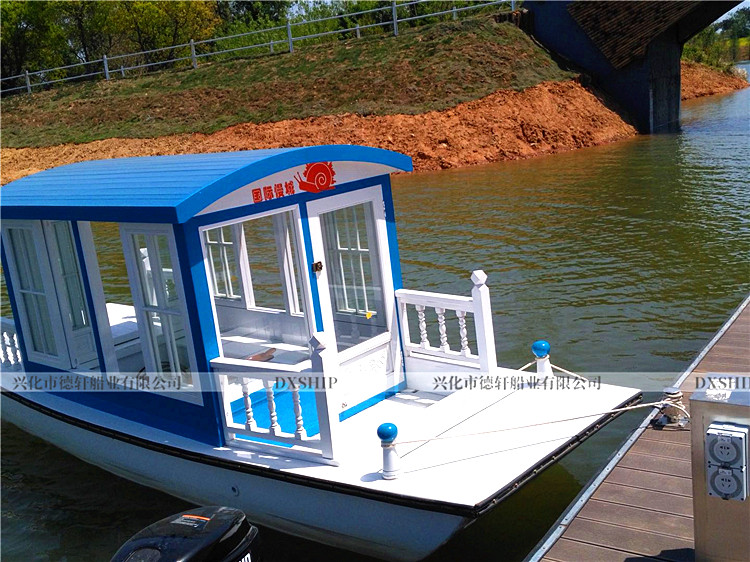 5.0米观光船规格:5.0*1.8m核载:6人使用区域:B、C级航区(水库、人工湖、内河)材质:船体板材:4cm厚进口花旗松龙骨:非洲银口、冰糖果木船体防护:10层高分子无碱玻璃纤维布(免维护)电动配置:电机:1.5KW*1台(永磁无刷)航速:3~6Km/h续航:根据要求搭配电池汽油配置:两冲程40匹(雅马哈后舷机)