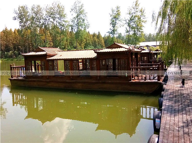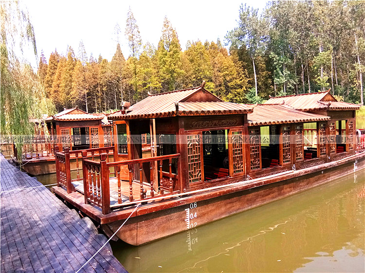 10.3米画舫船规格:10.3*3.2m核载:24人使用区域:B、C级航区(水库、人工湖、内河)材质:船体板材:4cm厚进口花旗松龙骨:印尼菠萝格、非洲银口、冰糖果木船体防护:10层高分子无碱玻璃纤维布(免维护)电动配置:电机:5.5KW*1台(永磁无刷)航速:8~12Km/h续航:根据要求搭配电池汽油配置:四冲程60匹(雅马哈后舷机)