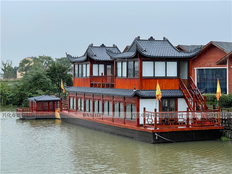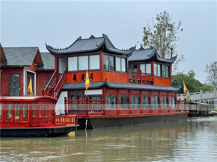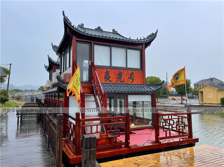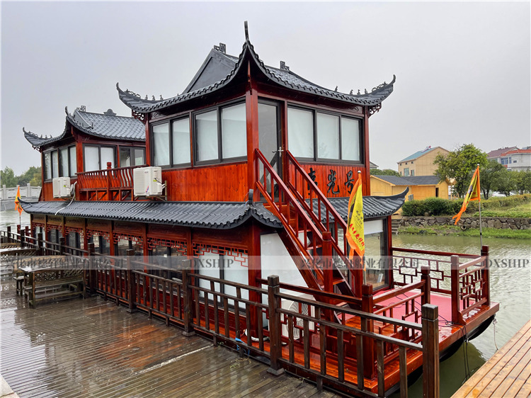 16.0米画舫船规格:16.0*4.80m核载:80人使用区域:B、C级航区(水库、人工湖、内河)材质:船体板材:4cm厚进口花旗松龙骨:印尼菠萝格、非洲银口、冰糖果木船体防护:10层高分子无碱玻璃纤维布(免维护)电动配置:(选配)汽油配置:四冲程60匹(雅马哈后舷机)